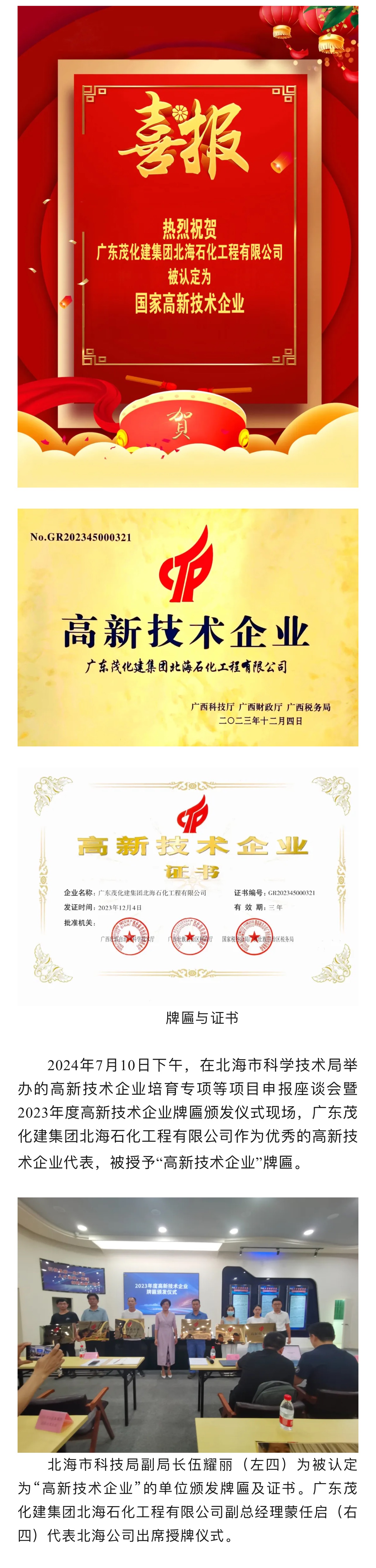 喜報|廣東茂化建集團(tuán)北海石化工程有限公司 躋身“國家高新技術(shù)企業(yè)”行列