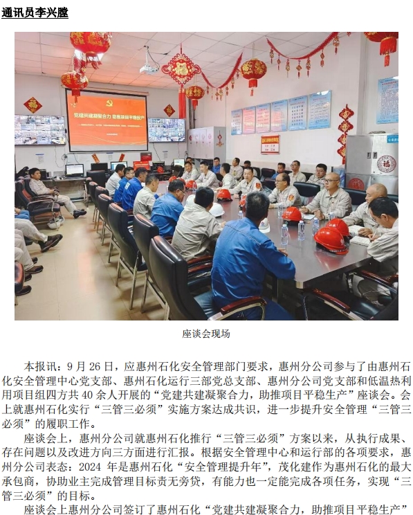 惠州分公司與業(yè)主開展 “黨建共建凝聚合力,助推項(xiàng)目平穩(wěn)生產(chǎn)”座談會